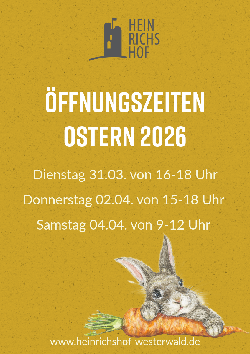 Ostern 2026 sind wir zusätzlich am Donnerstag den 02.04. von 15-18 Uhr für Sie da und haben unseren Hofverkauf geöffnet!